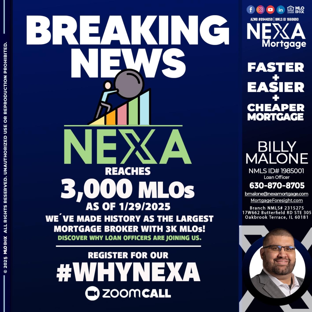 Hi, my name is Billy Malone. I’m a Loan Officer with NEXA Mortgage LLC., offering personalized mortgage solutions, fast customized quotes, great rates and service with integrity.