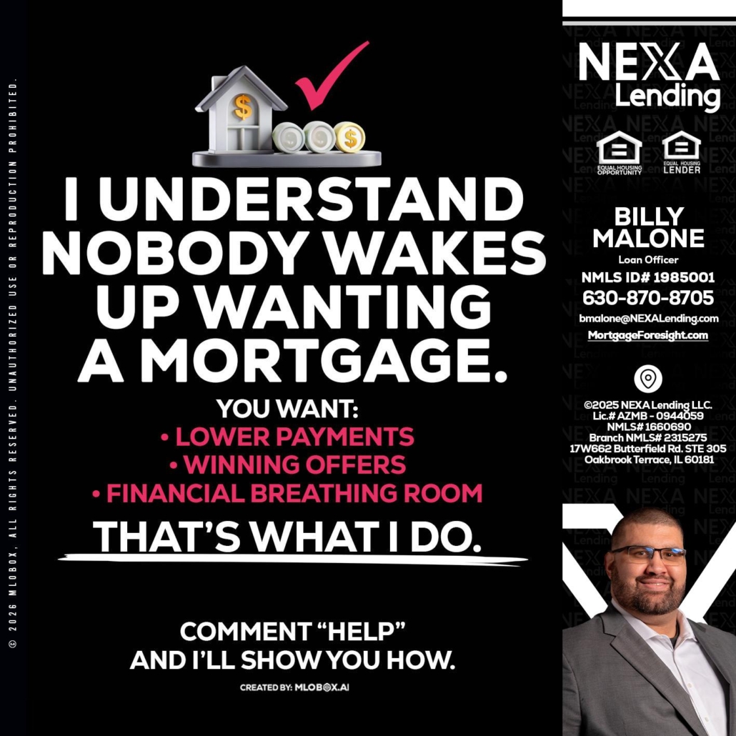 I UNDERSTAND - Billy Malone -Loan OfficerHi, my name is Billy Malone. I’m a Loan Officer with NEXA Lending LLC., offering personalized mortgage solutions, fast customized quotes, great rates and service with integrity.