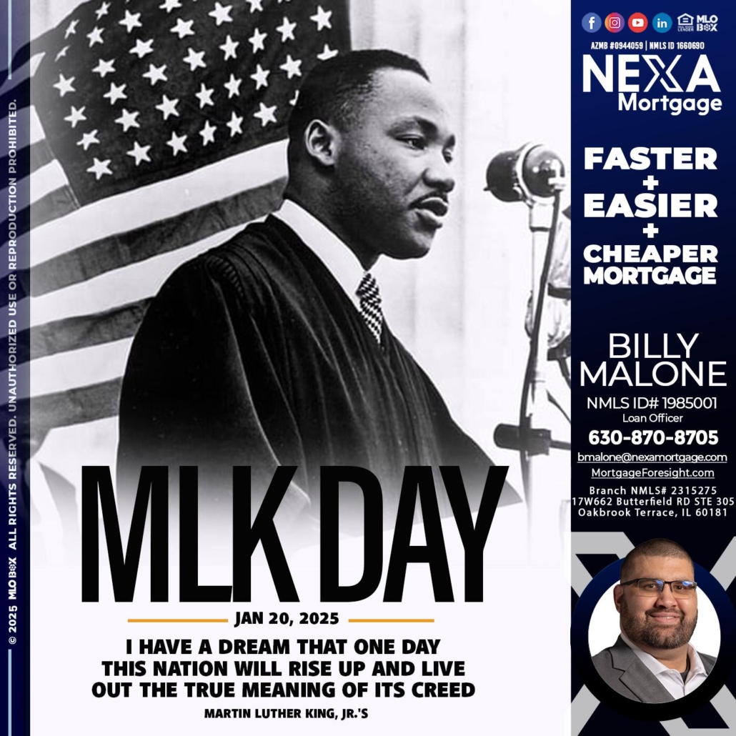 MLK DAY - Billy Malone -Loan OfficerHi, my name is Billy Malone. I’m a Loan Officer with NEXA Mortgage LLC., offering personalized mortgage solutions, fast customized quotes, great rates and service with integrity.