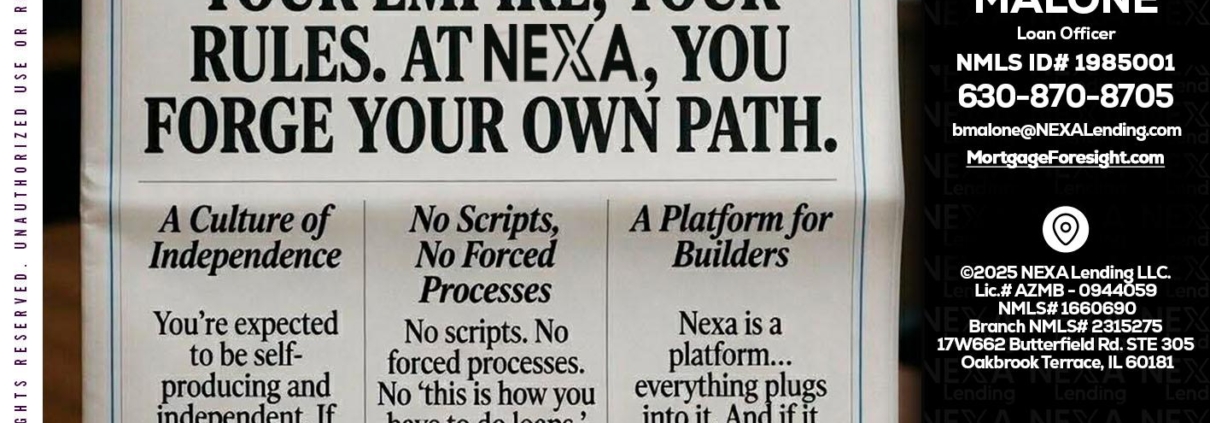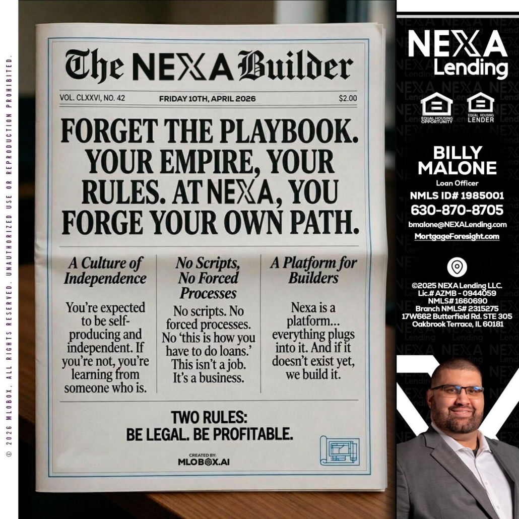 Hi, my name is Billy Malone. I’m a Loan Officer with NEXA Lending LLC., offering personalized mortgage solutions, fast customized quotes, great rates and service with integrity.