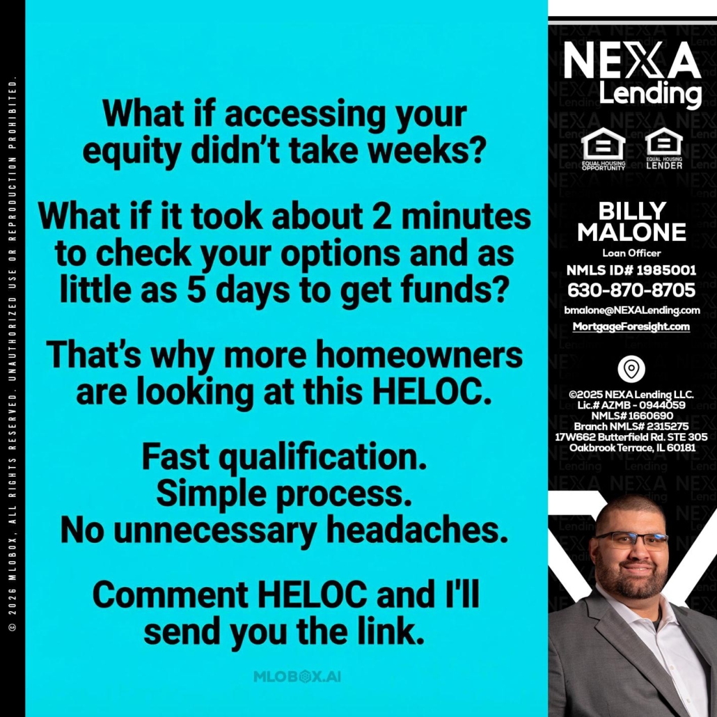 Hi, my name is Billy Malone. I’m a Loan Officer with NEXA Lending LLC., offering personalized mortgage solutions, fast customized quotes, great rates and service with integrity.